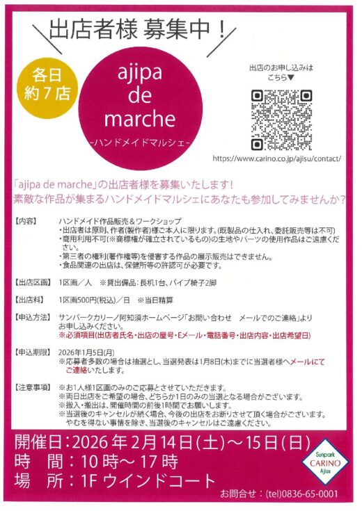 2月 ajipa de marche ーハンドメイドマルシェー 出店者様募集中! 「ajipa de marche」の出店者様を募集いたします!素敵な作品が集まるハンドメイドマルシェにあなたも参加してみませんか?