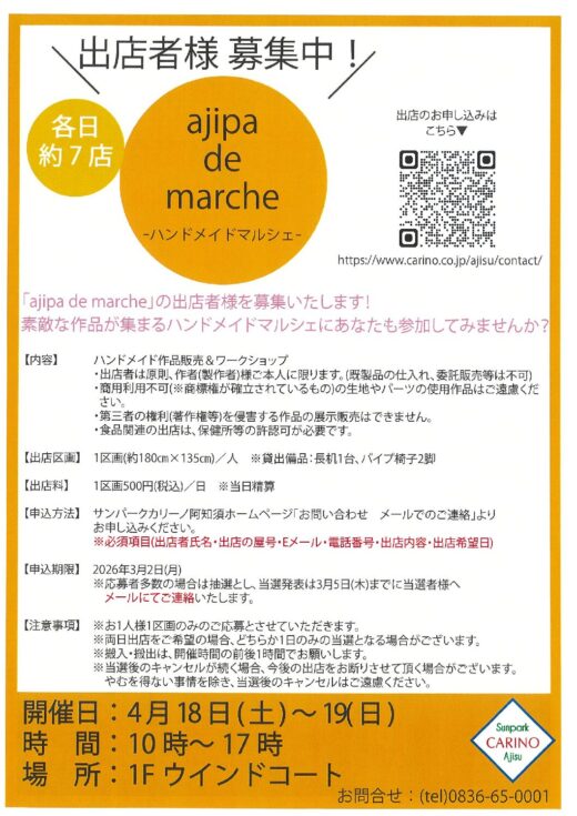 4月 ajipa de marche ーハンドメイドマルシェー 出店者様募集中! 「ajipa de marche」の出店者様を募集いたします!素敵な作品が集まるハンドメイドマルシェにあなたも参加してみませんか?
