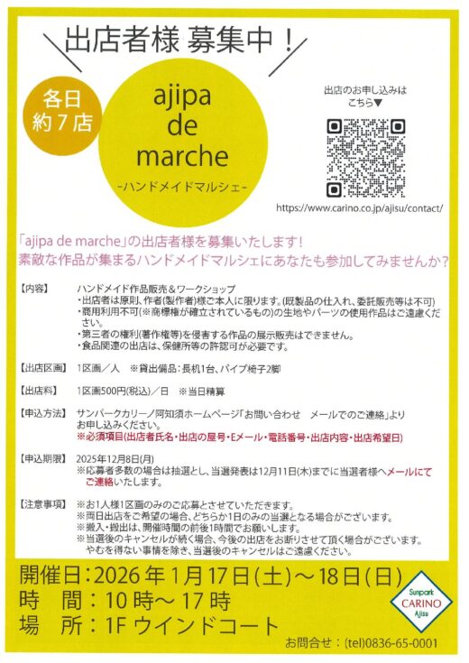 1月 ajipa de marche ーハンドメイドマルシェー 出店者様募集中! 「ajipa de marche」の出店者様を募集いたします!素敵な作品が集まるハンドメイドマルシェにあなたも参加してみませんか?