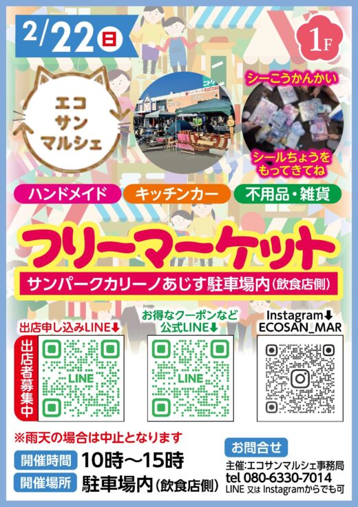 フリーマーケット エコサンマルシェフリーマーケット開催!ハンドメイド、キッチンカー、不用品・雑貨、シール交換会(シール帳を持ってきてね)※雨天の場合は中止となります。 日程2/22(日) 時間10時~15時 場所駐車場内(飲食店側)