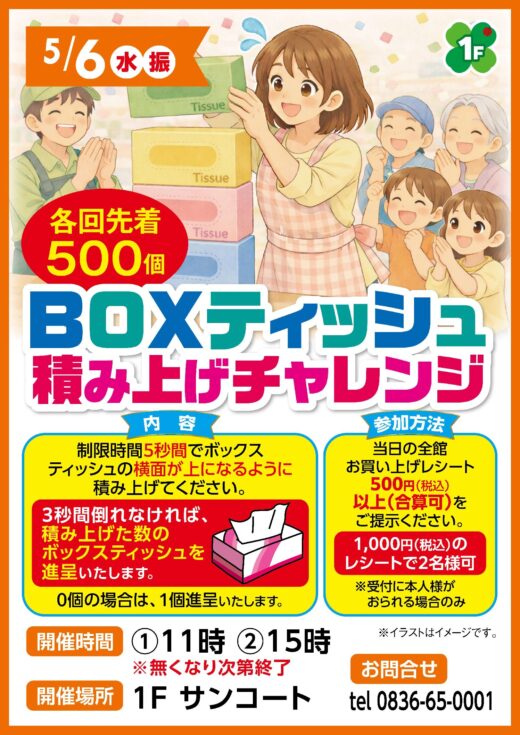 3秒間倒れなければ積み上げた数のボックスティッシュを進呈いたします