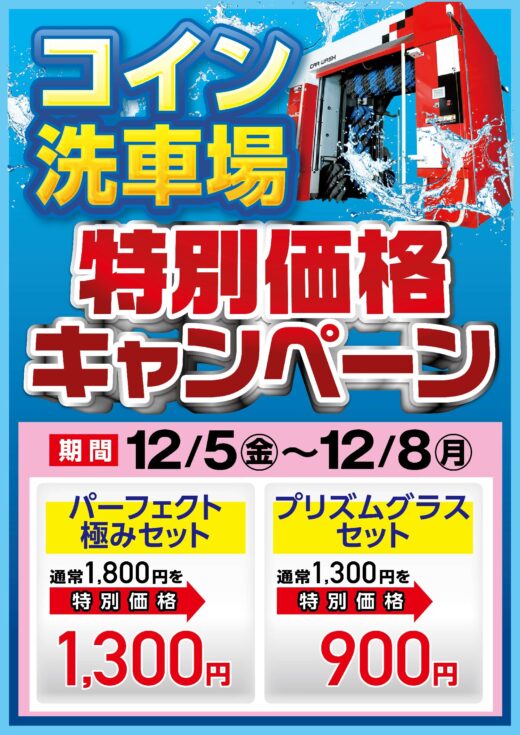 コイン洗車場 特別価格キャンペーン [2025-12-05] 〈パーフェクト極みセット〉通常1,800円を特別価格1,300円 500円お得! 〈プリズムグラスセット〉通常1,300円を特別価格900円 400円お得!