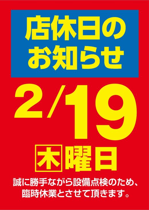は、誠に勝手ながら設備点検のため、臨時休業とさせて頂きます。