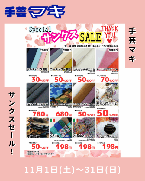 ショップ情報 お知らせ 手芸マキ 2F 【手芸マキ】SpecialサンクスSALE✨ [2025-11-01] 2階手芸マキでは 11/1〜11/30までSpecialサンクスSALEを開催中🧵♡ お買い得商品をたっぷり取り揃えております この機会にぜひお立寄りくださいませ♪ 皆様のご来店お待ちしております🪡🧶