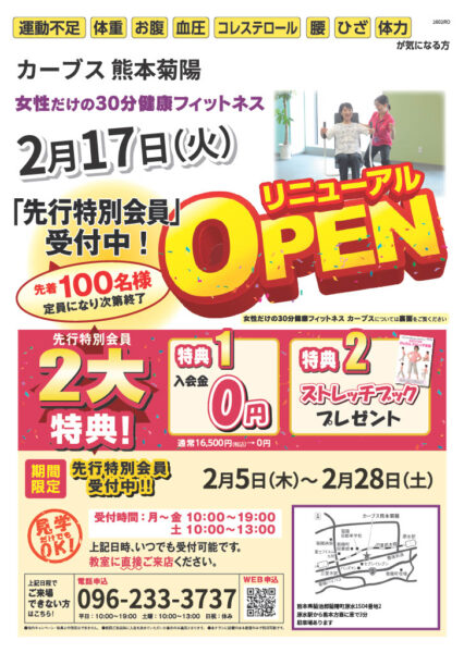 ショップ情報 お知らせ カーブス 熊本菊陽店 2F 2/17『カーブス』OPEN! [2026-02-22] 2月17日(火)、2階に女性だけの30分健康フィットネス🧘♀️ 『カーブス』がオープンいたしました!✨ この機会にぜひお越しくださいませ😊 皆様のご来店お待ちしております♪