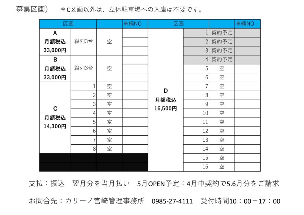 カリーノ宮崎管理事務所 月極駐車場 契約者募集! [2026-04-07] 2026年5月 新たに月極駐車場がopen✨契約者募集中です◎◆料金A(縦列3台):月額33,000円(税込)B(縦列3台):月額33,000円(税込)C:月額14,300円(税込)D:月額16,500円(税込)ーーーーーーーーーーーーーーーーーーーーお問い合わせは下記お電話まで!◆お問い合わせ先カリーノ宮崎 管理事務所 0985-27-4111受付時間 10:00~17:00