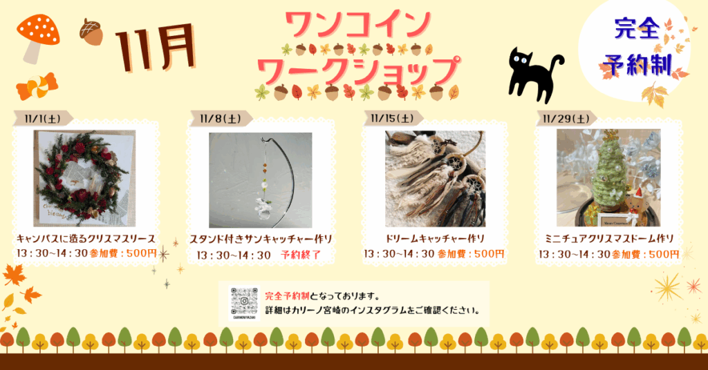カリーノ宮崎管理事務所 11月のワンコインワークショップ😆 [2025-10-09] 11月も楽しいワンコインワークショップが盛りだくさん😆残り予約可能なワークショップはドリームキャッチャーのみとなっております♪こちらも大変人気ですので、ご予約はお早めにー✨