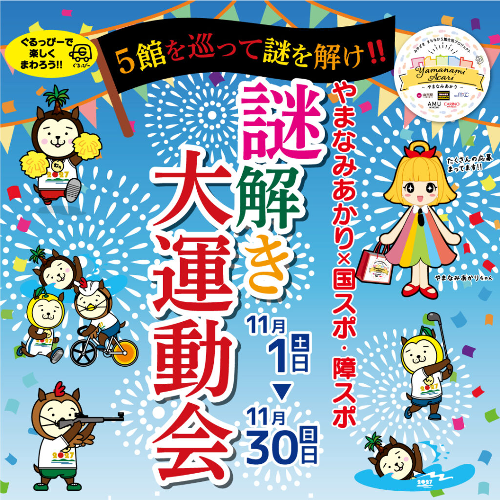 カリーノ宮崎管理事務所 11/1(土)~11/30(日)5館合同イベント開始! [2025-10-31] 11/1(土)~11/30(日)で5館合同イベントが開催されます!今回は謎解き大運動会✨5館をまわって謎を解き、チラシに掲載してある公式lineより応募しよう!みなさまのご参加お待ちしております😆