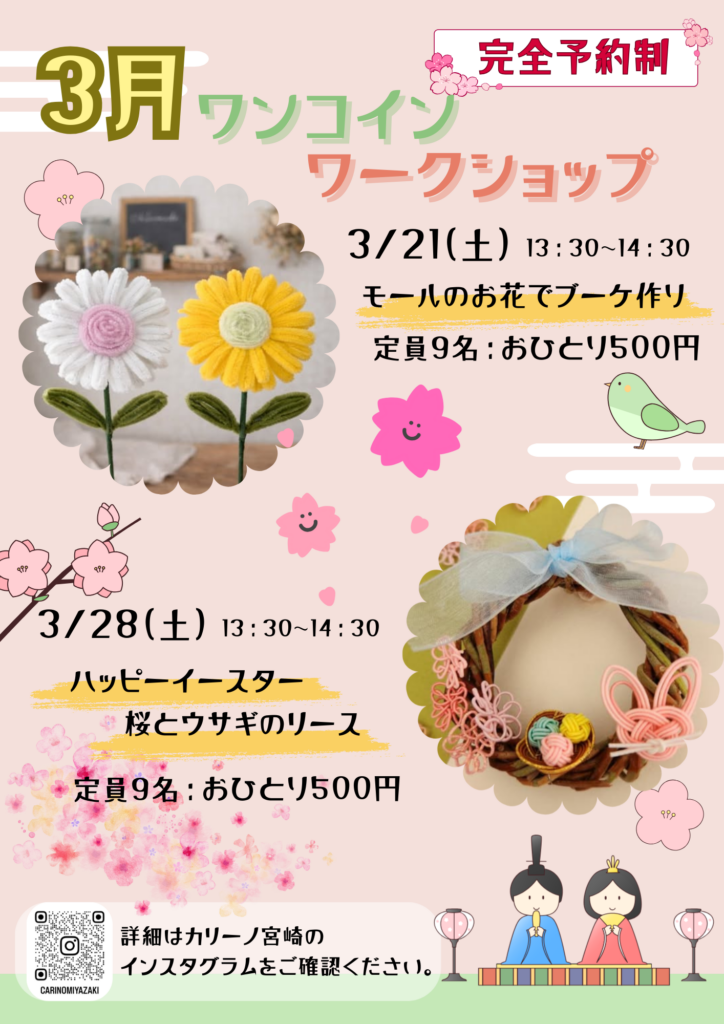 カリーノ宮崎管理事務所 3月のワンコインワークショップ♪ [2026-02-11] 3月のワンコインワークショップも春らしいワークショップになっております😆モールのお花でブーケ作りはまだ予約を受付中です✨ぜひカリーノ宮崎のインスタグラムをご確認ください🎉