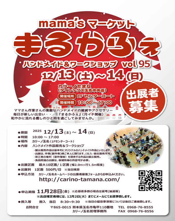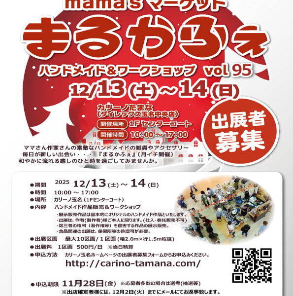 お知らせ イベント 1Fセンターコート まるかふぇvol.95出展者募集 [2025-11-11] ※まるかふぇ 営業時間厳守 10:00~17:00 17:00まで営業をお願い致します。 ■やむを得ない事情がある場合は管理事務所までご連絡をお願い致します。 出店応募フォーム*=必須項目出店者氏名 * 出店の屋号 * Eメール * 出店内容 * 出店希望日 * その他・補足