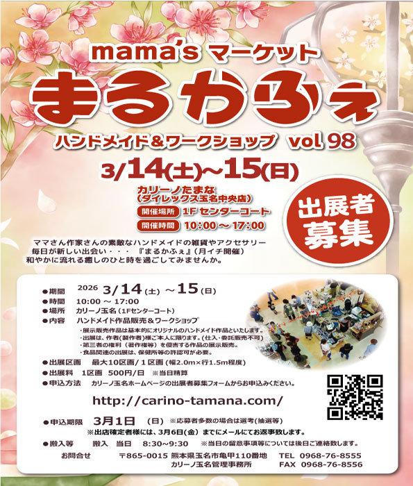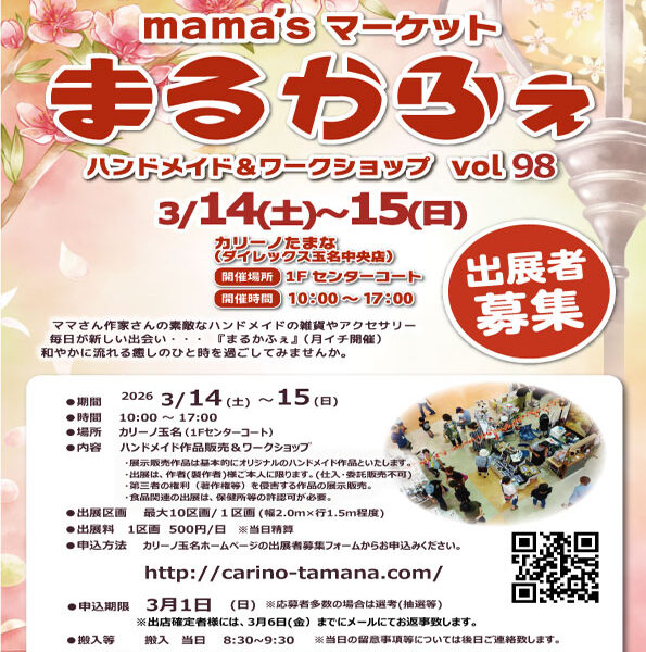 お知らせ イベント 1Fセンターコート まるかふぇvol.98出展者募集!! [2026-02-13] ※まるかふぇ 営業時間厳守 10:00~17:00 17:00まで営業をお願い致します。 ■やむを得ない事情がある場合は管理事務所までご連絡をお願い致します。 出店応募フォーム*=必須項目出店者氏名 * 出店の屋号 * Eメール * 出店内容 * 出店希望日 * その他・補足