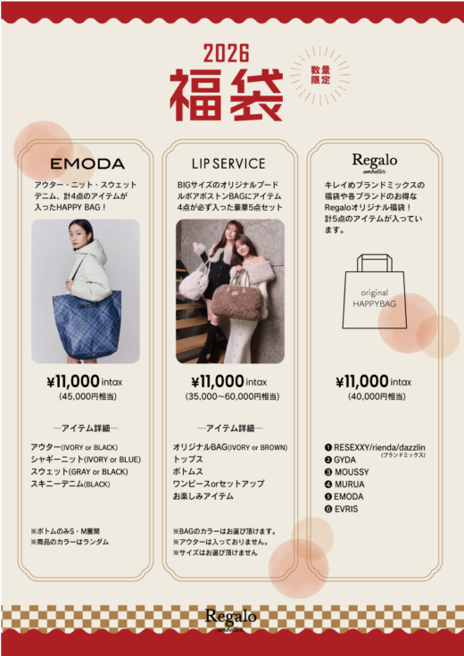 キレイめブランドミックスの福袋や各ブランドのお得なRegaloオリジナル福袋!