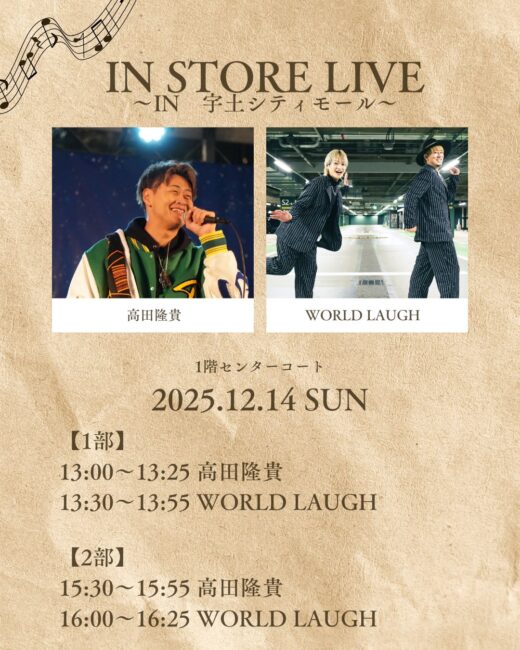 高田隆貴&WorldLoughライブイベント! [2025-12-12] 高田隆貴&WorldLoughライブイベントを開催します!ぜひ、見に来てくださいね! 日程12/14(日) 時間①13:00~ ②15:30~ 場所1階センターコート