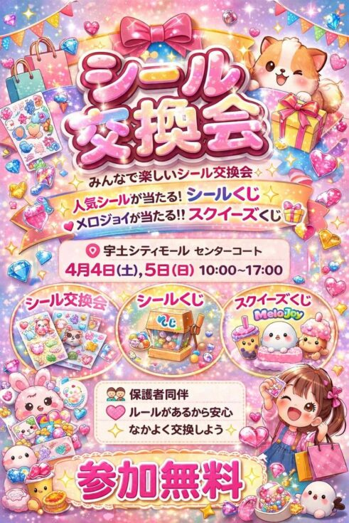 シール交換会&スクイーズくじ [2026-04-02] 当日はシールの交換会を実施します!更にシールくじとスクイーズくじも開催します!ぜひご参加ください! 日程4/4(土)、4/5(日) 時間10:00~17:00 場所1階センターコート