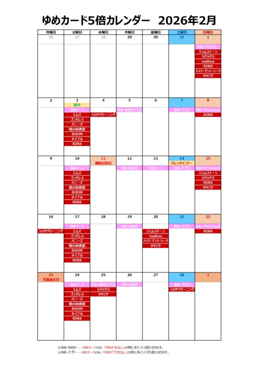 【2月】ゆめカード5倍カレンダー